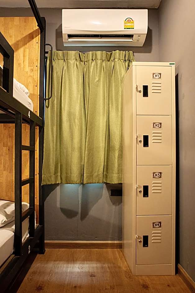 This bed in dormitory room is equipped with air conditioning, a small shelf with mobile charger and a key card access. Guests can make use of a shared bathroom and toilet.